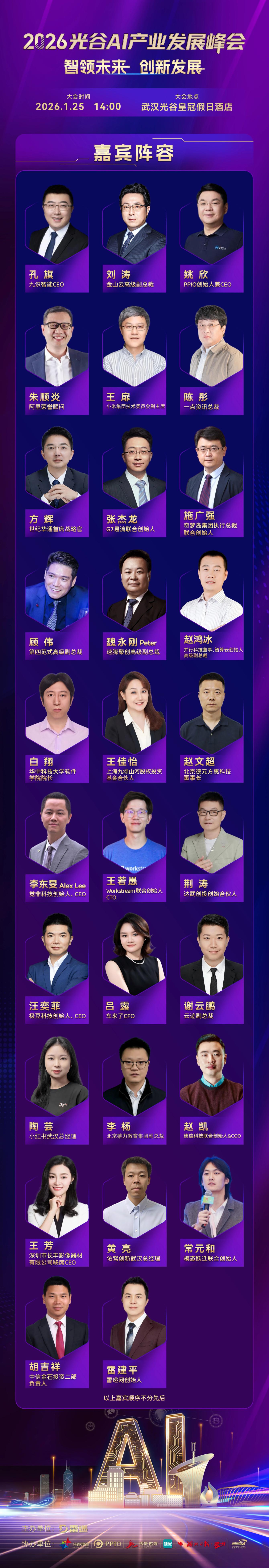 本次《2026光谷AI产业发展峰会》的活动主旨是诚邀对武汉感兴趣的企业家、创业者、投资人到武汉交流与发展,探索与发现投资机会。《2026光谷AI产业发展峰会》预计现场会非常火爆,到场人数将超过400人。