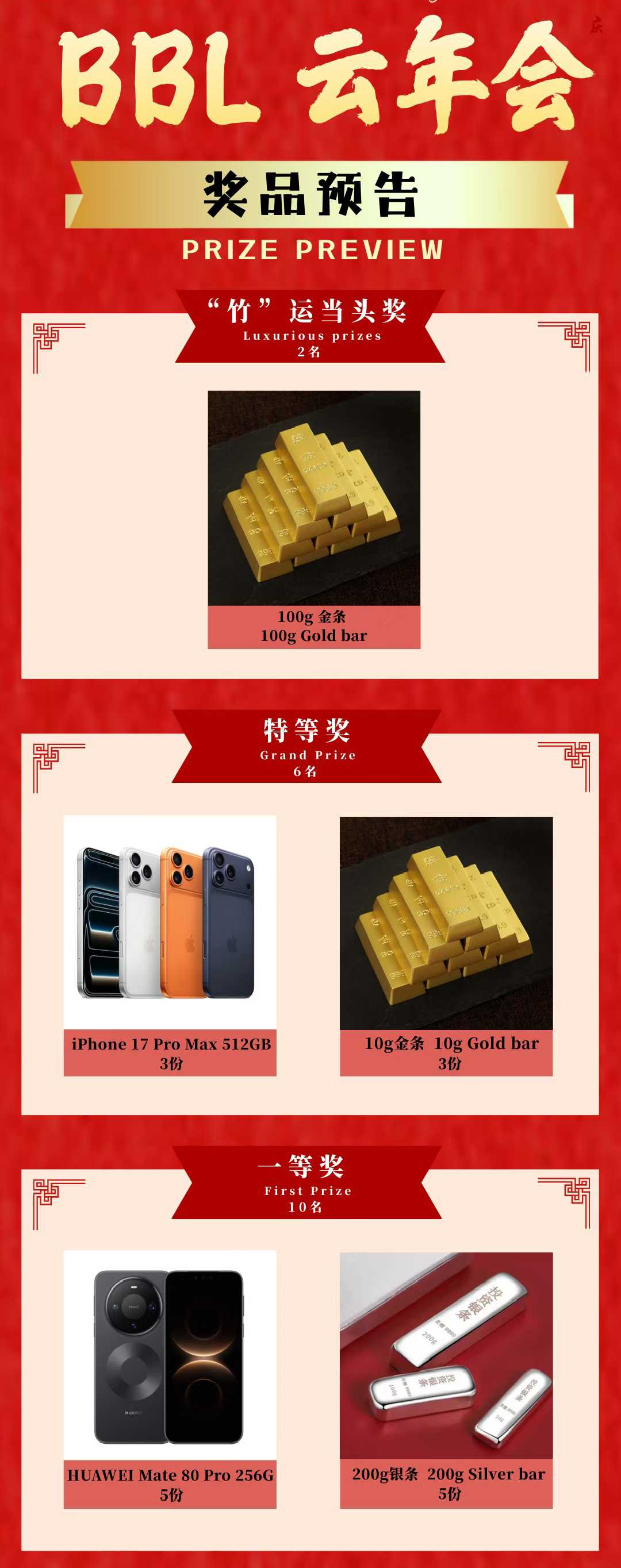 1月21日消息,拓竹科技年会的奖品预告出来了:不仅有两名幸运儿能抱走100克金条,iPhone 17 Pro Max、华为Mate 80 Pro、200克银条更是批量放送。