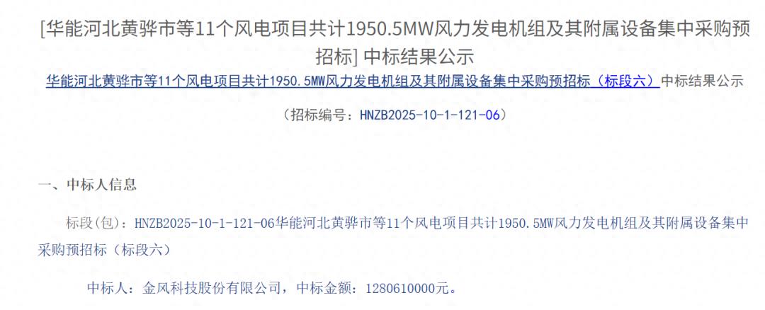 公告显示,金风科技股份有限公司成功中标该项目,中标金额为1280610000元。