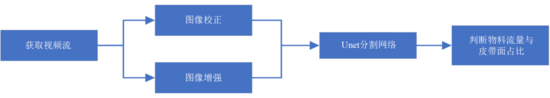 使用深度学习的带式输送机物料流量检测方法,实现带式输送机物料流量检测的智能调整上料。首先获取巡检机器人输送带运行状态的视频流,对物料图像进行校正、分割和增强预处理;构建基于深度学习的Unet分割网络,获得用于检测物料流量的网络权重;最后计算出物料流在输送带带面上的占比来判断流量的大小。带式输送机物料流量检测识别流程如图5所示。