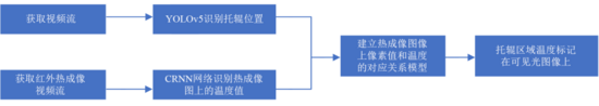 通过挂载巡检机器人摄像机,采用目标检测网络YOLOv5提取彩色托辊位置图,并映射到相应热力图上,使用CRNN网络识别热成像图的最高最低温度数值,建立热成像图上像素值与温度的对应关系模型,计算由步骤一预测出的托辊区域温度,并标记在原图像上,输送带托辊异常识别流程如图7所示。