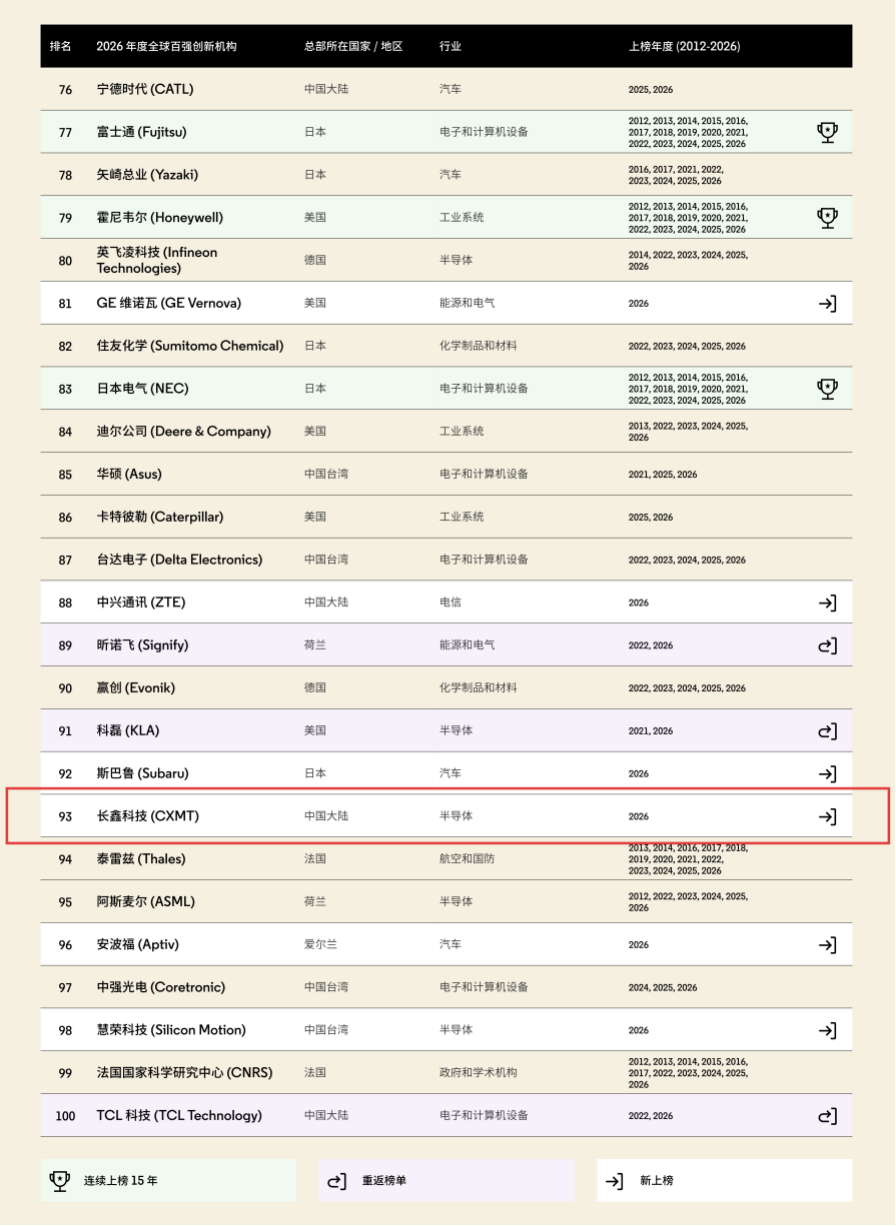 唯一上榜中国大陆半导体企业!长鑫科技跻身2026年科睿唯安“全球百强创新机构”