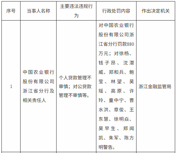 农业银行浙江省分行被罚880万,涉对公贷款管理不审慎等