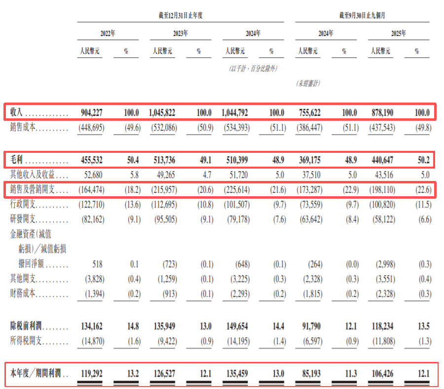 重营销、轻研发的SKG,研发费用率从2022年的9.1%一路降至2025年前三季度的6.6%,而销售费用率却从18.2%攀升至22.6%。