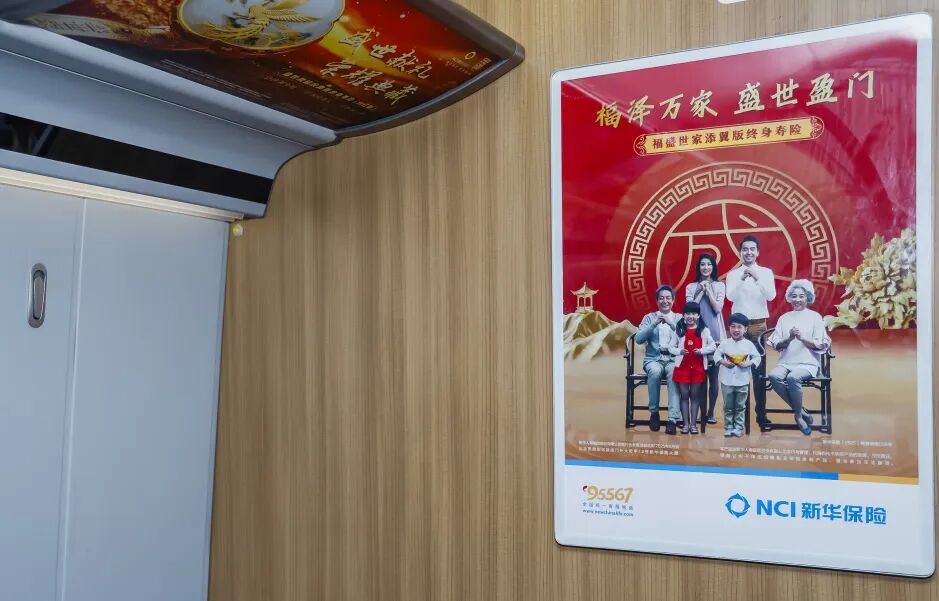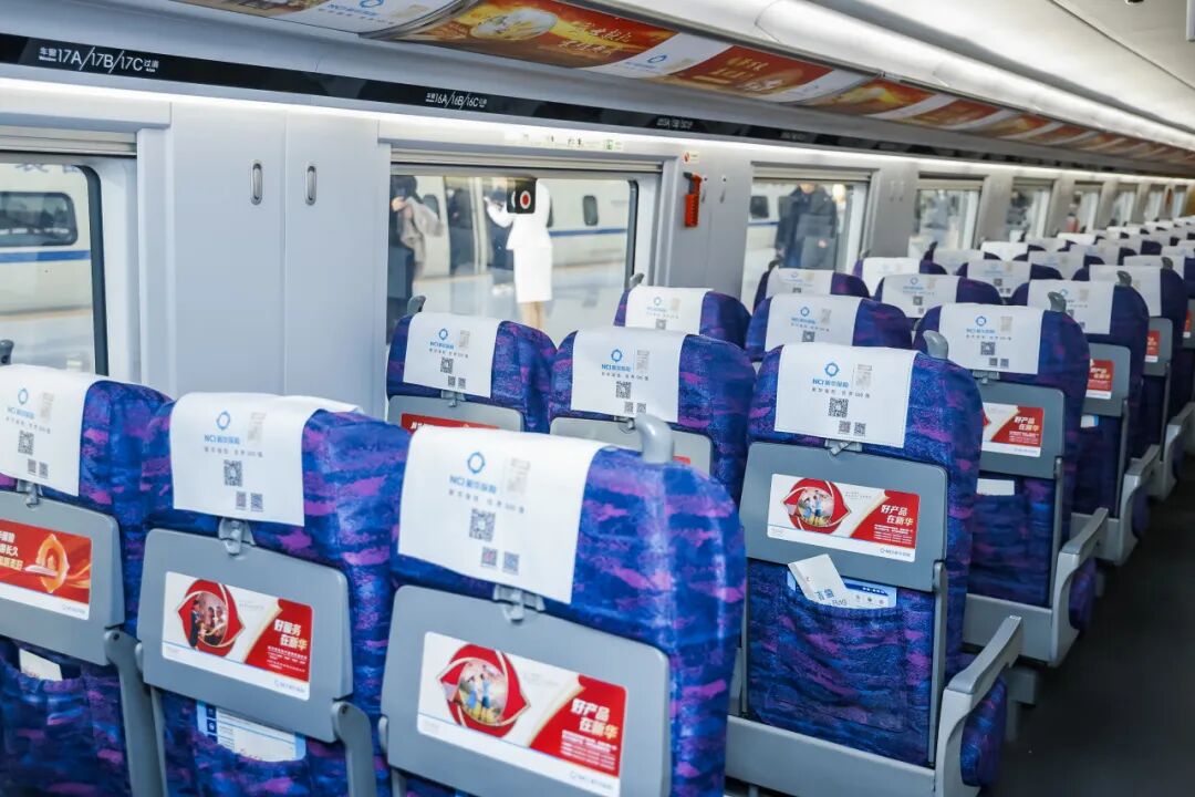 车厢内,旅客沉浸式体验品牌空间,座椅头巾、小桌贴、行李架海报、LED滚动屏等载体,将品牌理念自然融入旅客的目之所及处。