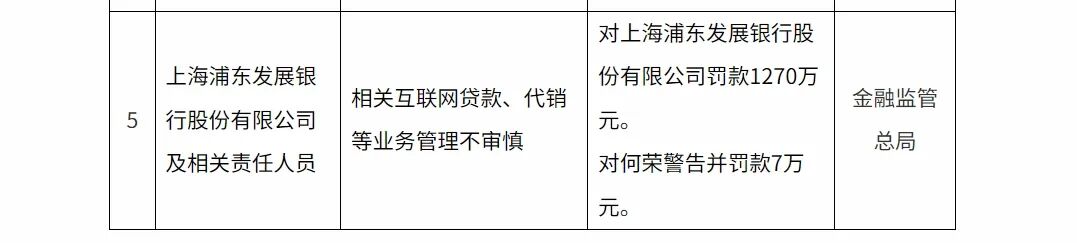 在去年10月份发布的那一笔罚款,同样还是因为代销,据国家金融监督管理总局官网披露,因相关互联网贷款、代销等业务管理不审慎,对浦发银行罚款1270万元。