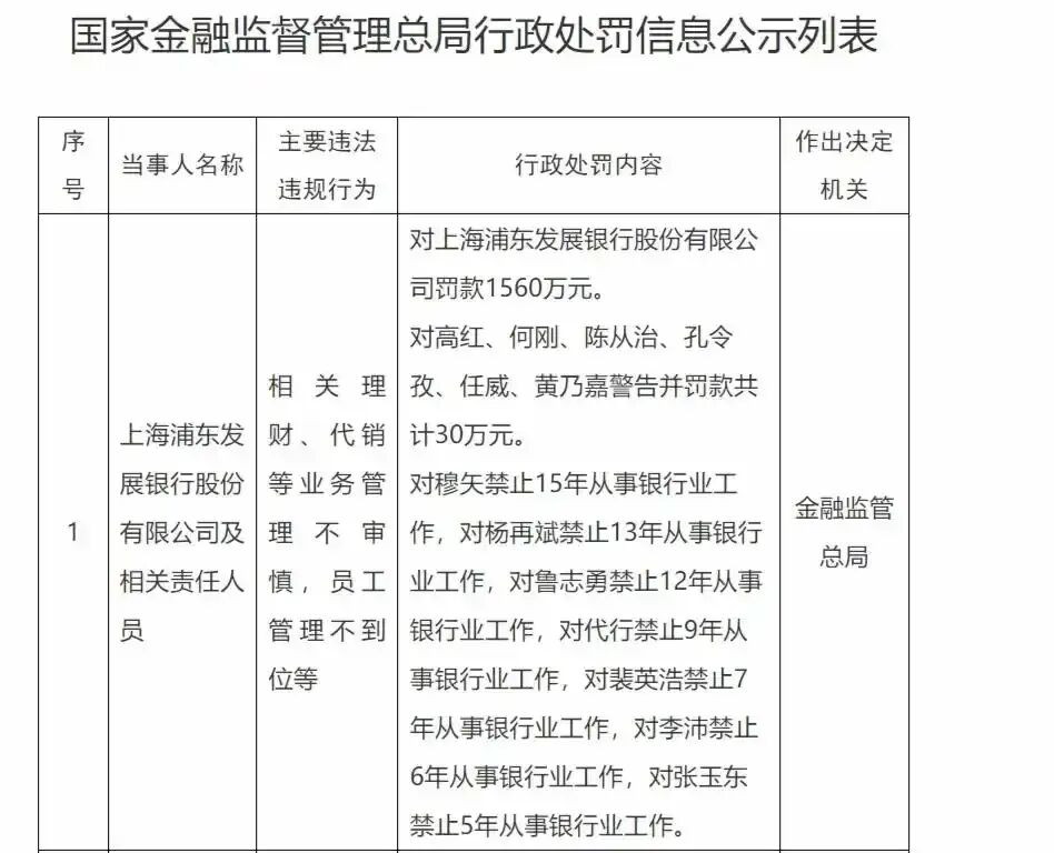 去年最后的一笔是2025年12月19日,国家金融监督管理总局官网披露,因相关理财、代销等业务管理不审慎,员工管理不到位等,对浦发银行罚款1560万元,对数名员工禁止从业,最长高达15年,并处以罚款。