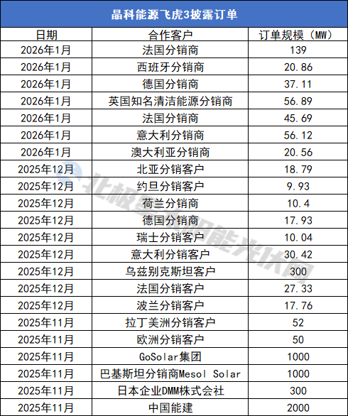 背后“利剑”,产品当为其一。2025年11月20日晶科能源新一代旗舰组件飞虎3正式量产下线,效率突破24.8%,功率可达670W。自此晶科能源也开启爆单模式,据统计自去年11月至今,晶科能源已主动披露了超5GW的飞虎3订单。