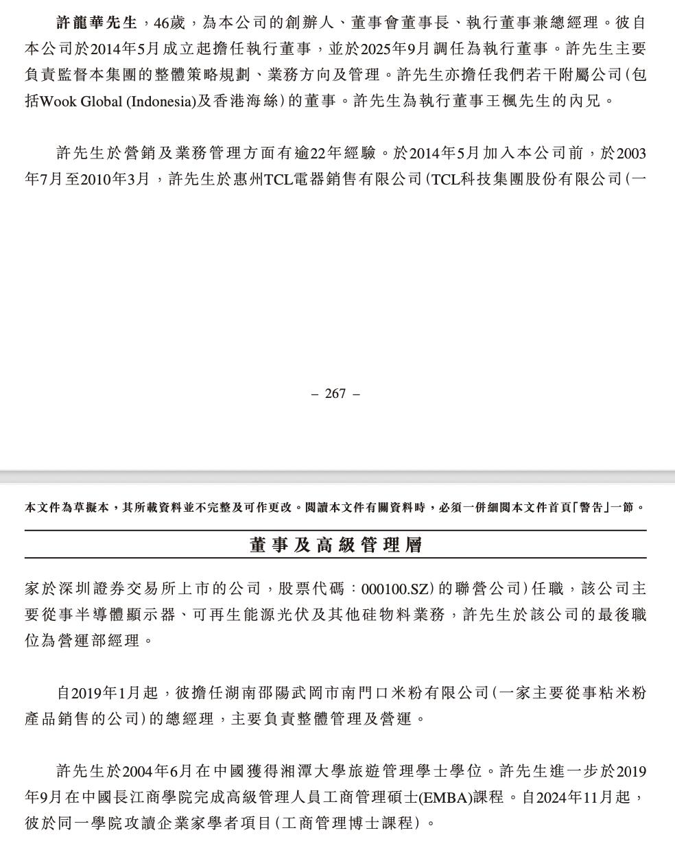 资料显示,许龙华,46岁,为公司的创办人、董事会董事长、执行董事兼总经理。其自公司于2014年5月成立起担任执行董事,并于2025年9月调任为执行董事。许龙华主要负责监督集团的整体策略规划、业务方向及管理。许龙华亦担任公司若干附属公司(包括Wook Global (Indonesia)及香港海丝)的董事。