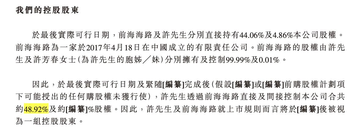 IPO前,前海海路及许龙华分别直接持有44.06%及4.86%公司股权。前海海路为一家于2017年4月18日在中国成立的有限责任公司。前海海路的股权由许龙华及许芳春(为许龙华的胞姐/妹)分别拥有及控制99.99%及0.01%。