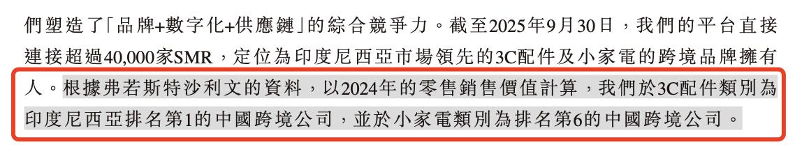 根据弗若斯特沙利文的资料,以2024年的零售销售价值计算,沃客非凡于3C配件类别为印度尼西亚排名第1的中国跨境公司,并于小家电类别为排名第6的中国跨境公司。