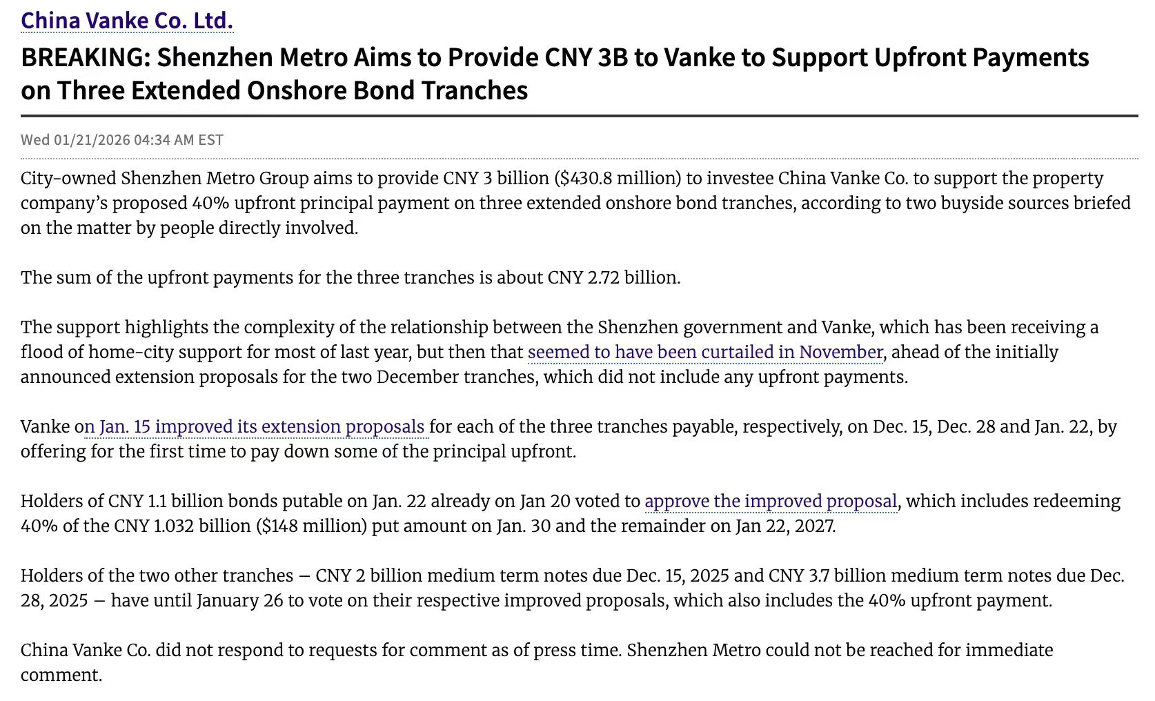 Octus(原Reorg):深圳地铁给万科提供30亿资金以支付三笔展期债券的40%首付款