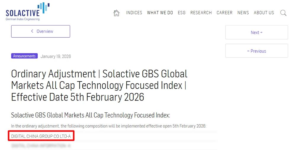 1月19日,国际知名指数机构Solactive发布了最新“Solactive GBS Global Markets All Cap Technology Focused Index(Solactive GBS全球市场全市值科技指数)”。凭借在人工智能等前沿技术领域的持续投入与卓越的科技创新实力,神州数码(000034.SZ)入选该指数,于2026年2月5日开盘起正式生效。