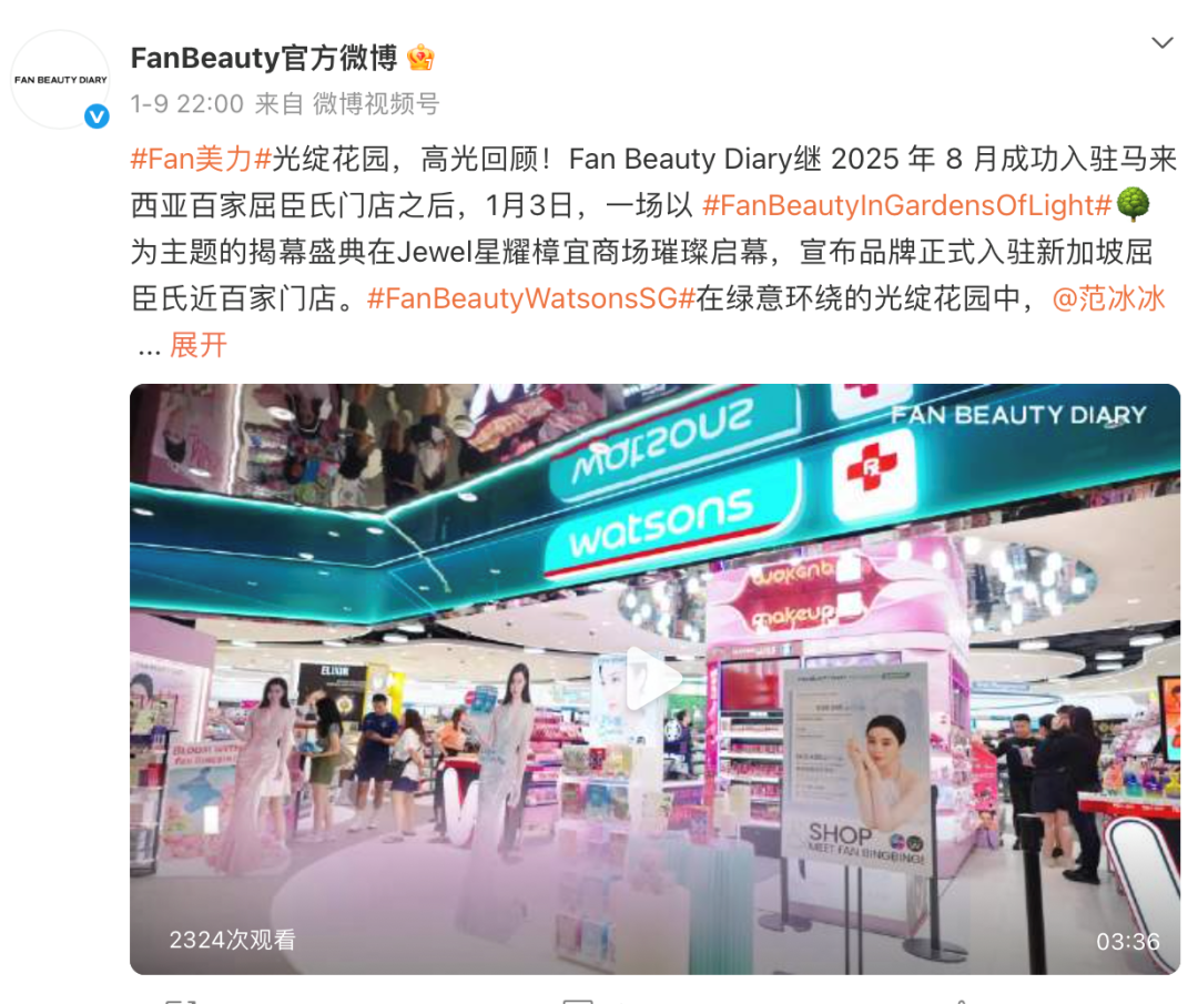 而此次成功并非昙花一现,屈臣氏与FANBEAUTY 的合作也越发紧密。2026年1月,FANBEAUTY 正式入驻新加坡屈臣氏近百家门店,官宣活动选址在新加坡星耀樟宜商场,范冰冰同样为该活动亮相站台。
