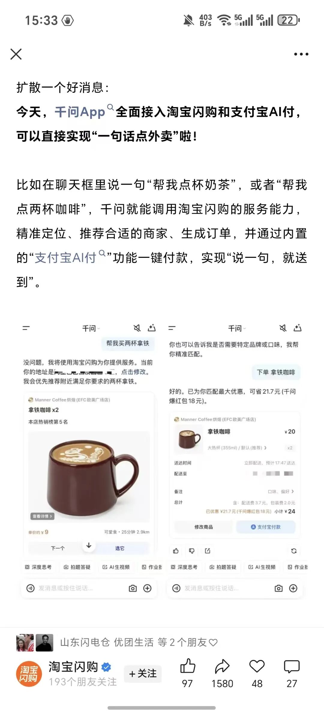 第二天,1月15日,淘宝闪购发布了一个消息《千问App介入淘宝闪购,推出“AI点外卖”》。全文如下: