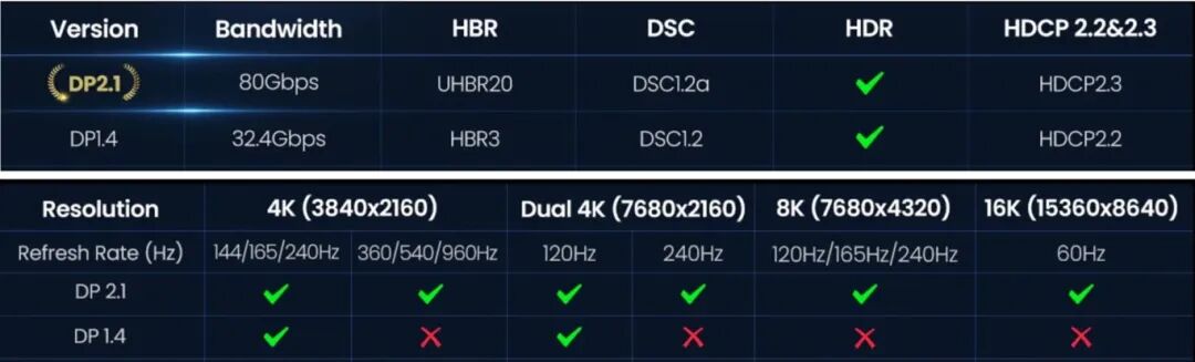 ● 16K 超清视觉:实现16K@60Hz(DSC)分辨率,超越传统DP标准,适用于专业与高端显示场景。
