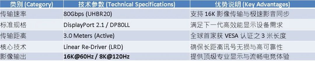 ● 领先地位:凭借 LRD 主动式技术,稳居全球首批 C TO DP80LL 3m 认证名单,完美实现 16K 极致影像传输。