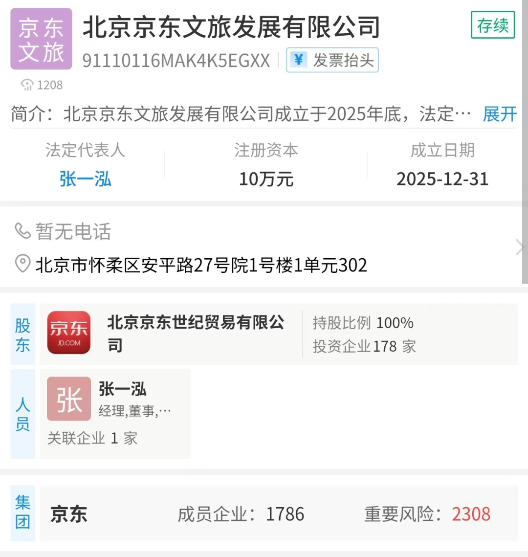 企查查APP显示,北京京东文旅发展有限公司于近期成立,经营范围包含旅游业务、歌舞娱乐活动、航空商务服务、体验式拓展活动及策划、组织文化艺术交流活动等。