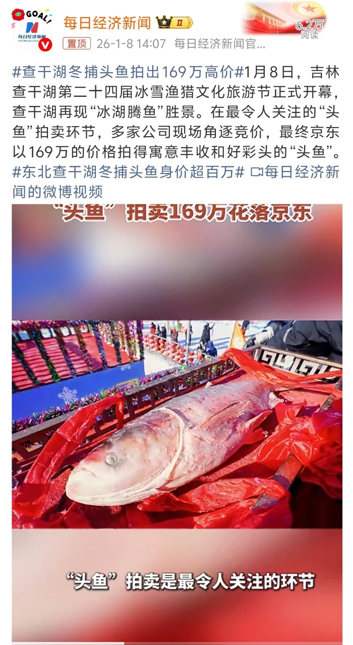 此前,京东便以169万元拍下查干湖头鱼,同时与查干湖渔场达成年度包销合作,拿下该渔场2025-2026产季近50%的产量。这也就意味着,消费者在市场上买到的正宗查干湖鱼,有近半数来自京东渠道。
