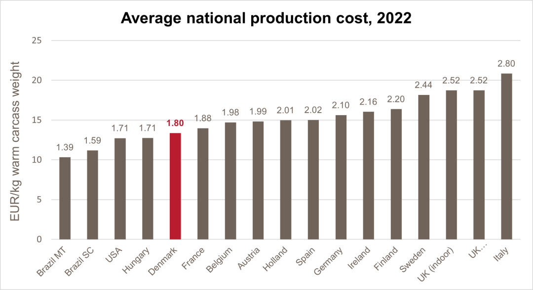 按照英国国家猪业协会(NPA)去年5月在欧洲养猪生产者大会(EPP)的报道,丹麦的生产成本是每公斤1.84欧元,按实时汇率计算超过14元人民币;而根据全球化猪业机构InterPIG的统计,产粮大国巴西的成本均线为1.39欧元-1.59欧元每公斤,换算后接近11.27元人民币。