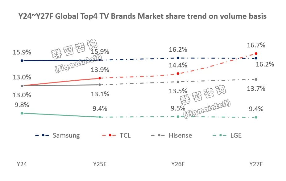 在这一背景下,头部阵营分化明显:三星以预计3530万台出货量、16%的市占率稳居第一;TCL排名第二,出货量预计达3041万台,同比增长5.4%,市占率提升至13.8%,与三星的份额差距由上年的2.9个百分点大幅收窄至2.2个百分点。紧随其后便是海信、LG及小米等品牌。
