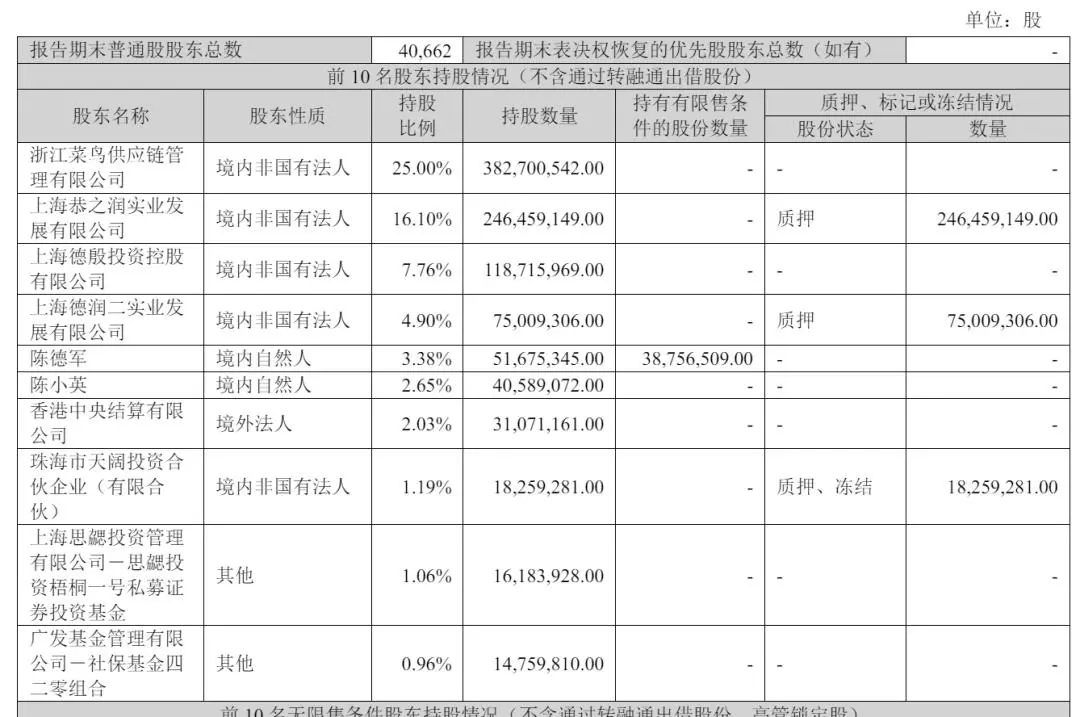 截至2025年9月30日,浙江菜鸟供应链管理有限公司持股25%,上海恭之润实业发展有限公司持股16.1%;