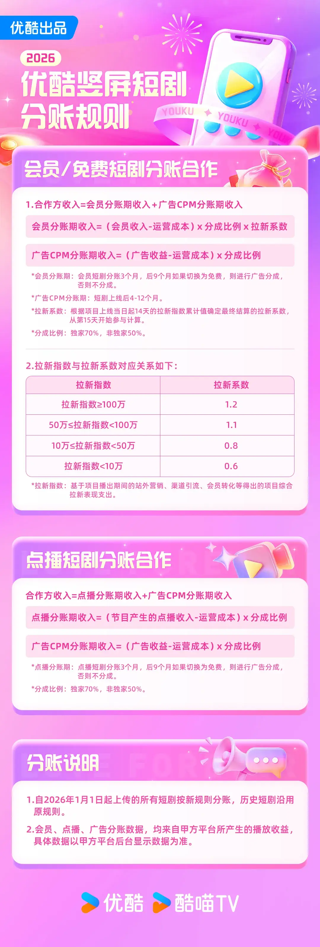 新年伊始,为进一步激励优质竖屏短剧作品、给予合作方更多曝光机会,优酷竖屏短剧分账规则全面升级,针对优质节目给予分账系数补贴、资源曝光倾斜,助力合作方更快更好地创作精品内容。