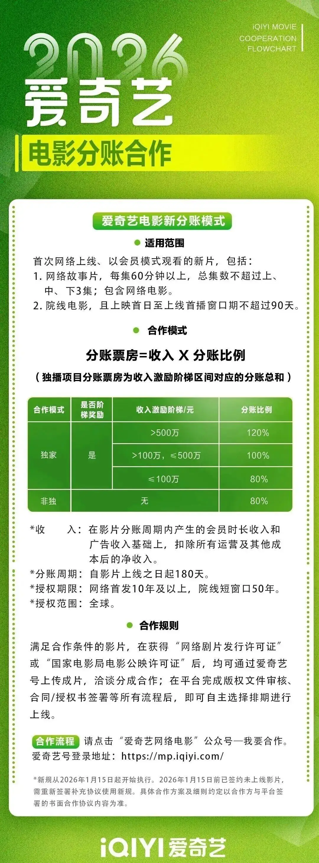 自2026年1月15日起爱奇艺电影分账合作模式全新调整。新规同步覆盖“网络故事片”及“院线短窗口期”分账合作。