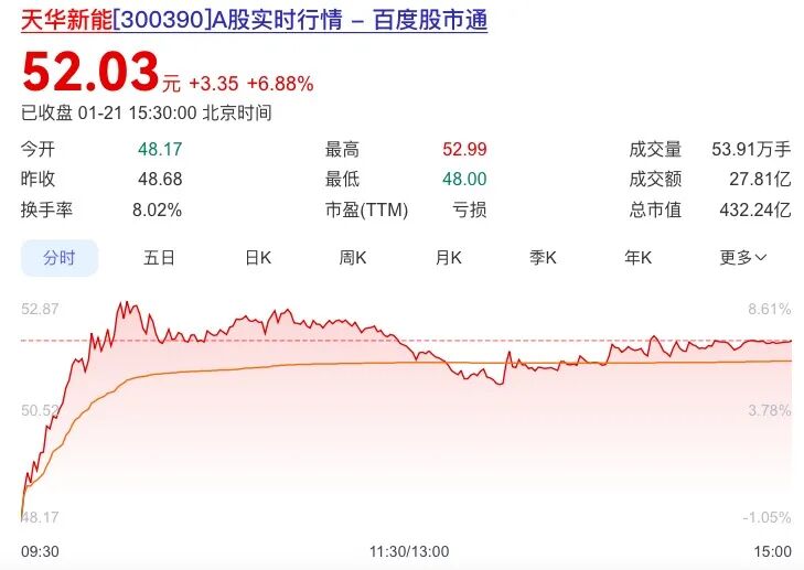 截至1月21日收盘,天华新能股价报52.03元/股,当日涨幅6.88%,总市值达432.24亿元。