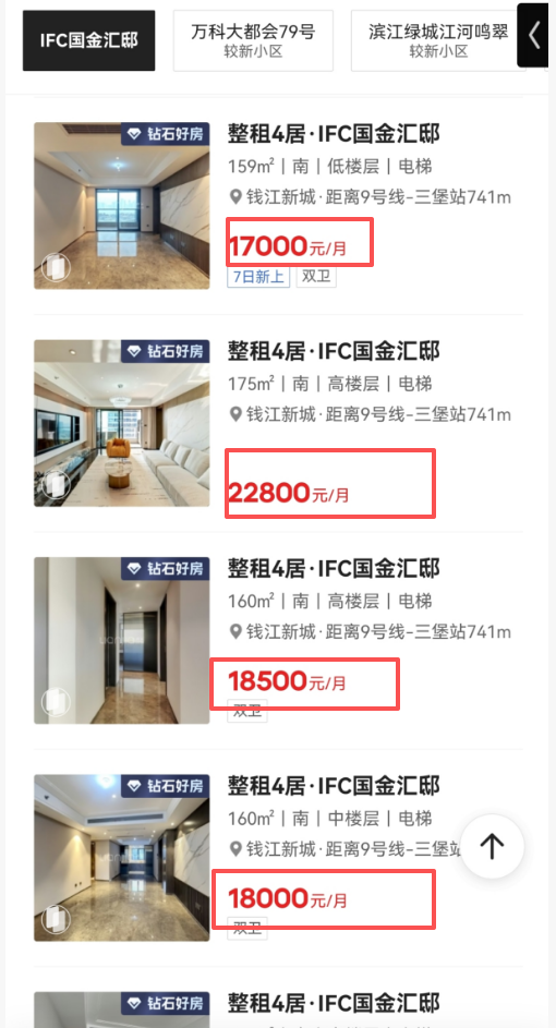 房源目前还不能交易,大批业主已经转向租赁市场。截至目前,首批交付的IFC住宅中,仅贝壳租房平台已有超50套出租上架,占比约17%。租金跨度比较大,从1.7万/月到最高的204㎡房源3.8万/月。其中,租金最低的一套是建筑面积为159㎡的房源,月租金1.7万。