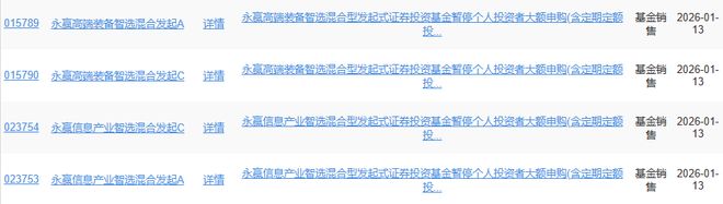 我在天天基金网查询到,1月13日,永赢基金曾发布公告,对上述两只产品实施个人投资者单日单账户100万元的申购上限,降温信号明显。