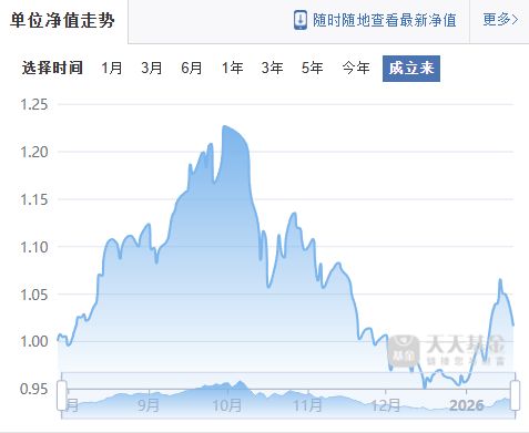 看看产品净值走势,妥妥的过山车。去年12月中旬,单位净值一度下探至0.95左右,最大回撤幅度达22.5%。换句话说: