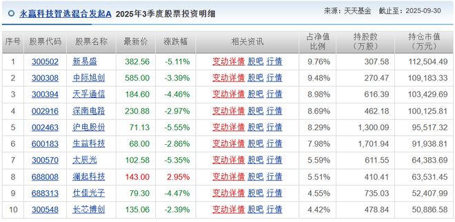 以永赢科技智选混合发起A为例,2025年2季度开始,该产品就坚定布局“易中天”组合,新易盛、中际旭创、天孚通信稳居前三大重仓;同时押注PCB板块,深南电路、沪电股份、生益科技紧随其后。
