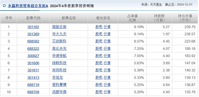 反映到投资风格上,就是“押注式”投资。同样以永赢科技智选混合发起A为例,2024年4季度的时候,其前十大持仓是这些: