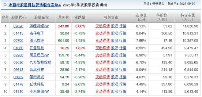 看2025年3季度前十大重仓股,高伟电子、腾讯控股、九方智投控股、蓝思科技、丘钛科技、小米集团等都有浮亏。