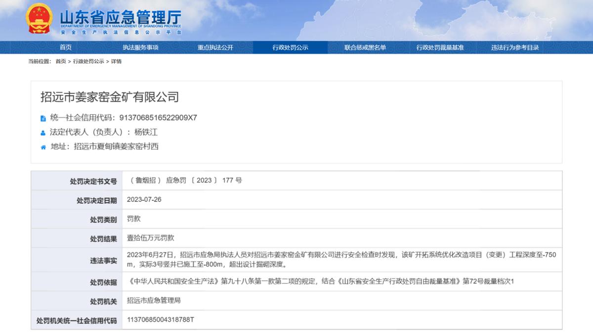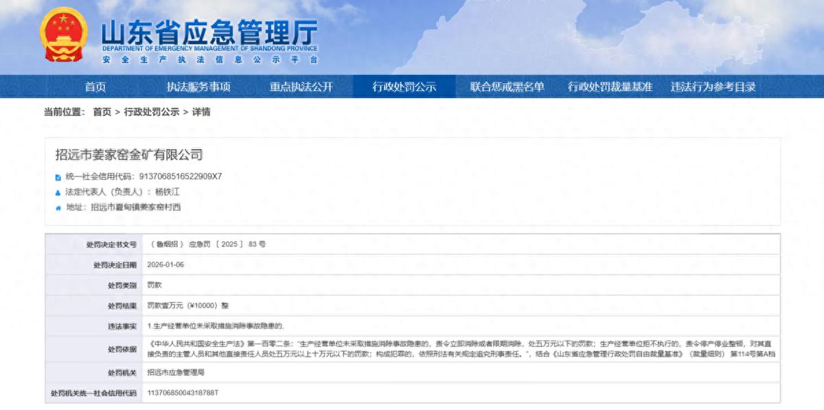 日前,山东省应急管理厅公布的行政处罚信息显示,招远市姜家窑金矿有限公司(简称“姜家窑金矿”)被查获“生产经营单位未采取措施消除事故隐患”的违法行为,被招远市应急管理局处以罚款1万元处罚。处罚决定日期为2026年1月6日。