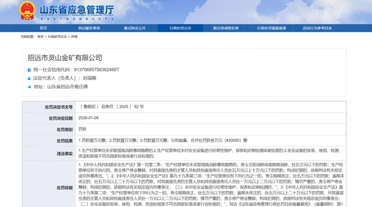 同日,招远市灵山金矿有限公司(简称“灵山金矿”)因“生产经营单位未采取措施消除事故隐患”、“生产经营单位未对安全设备进行经常性维护、保养和定期检测或者检查”、“安全设备的安装、使用、检测、改造和报废不符合国家标准或者行业标准”三项违法行为,被招远市应急管理局处以罚款3万元处罚。