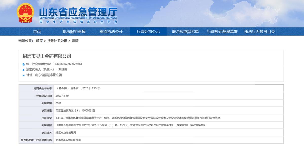 据了解,灵山金矿也多次被罚。灵山金矿2025年9月因“安全设备的安装、使用、检测、改造和报废不符合国家标淮或者行业标准”、“生产经营单位未在有较大危险因素的生产经营场所和有关设施、设备上设置明显的安全警示标志”违法行为,被招远市应急管理局罚款2万元;2025年6月因“生产经营单位未为从业人员提供符合国家标准或者行业标准的劳动防护用品”违法行为,被招远市应急管理局罚款3000元;2023年11月因“矿山、金属冶炼建设项目或者用于生产、储存、装卸危险物品的建设项目没有安全设施设计或者安全设施设计未按照规定报经有关部门审查同意”违法行为,被招远市应急管理局罚款15万元。
