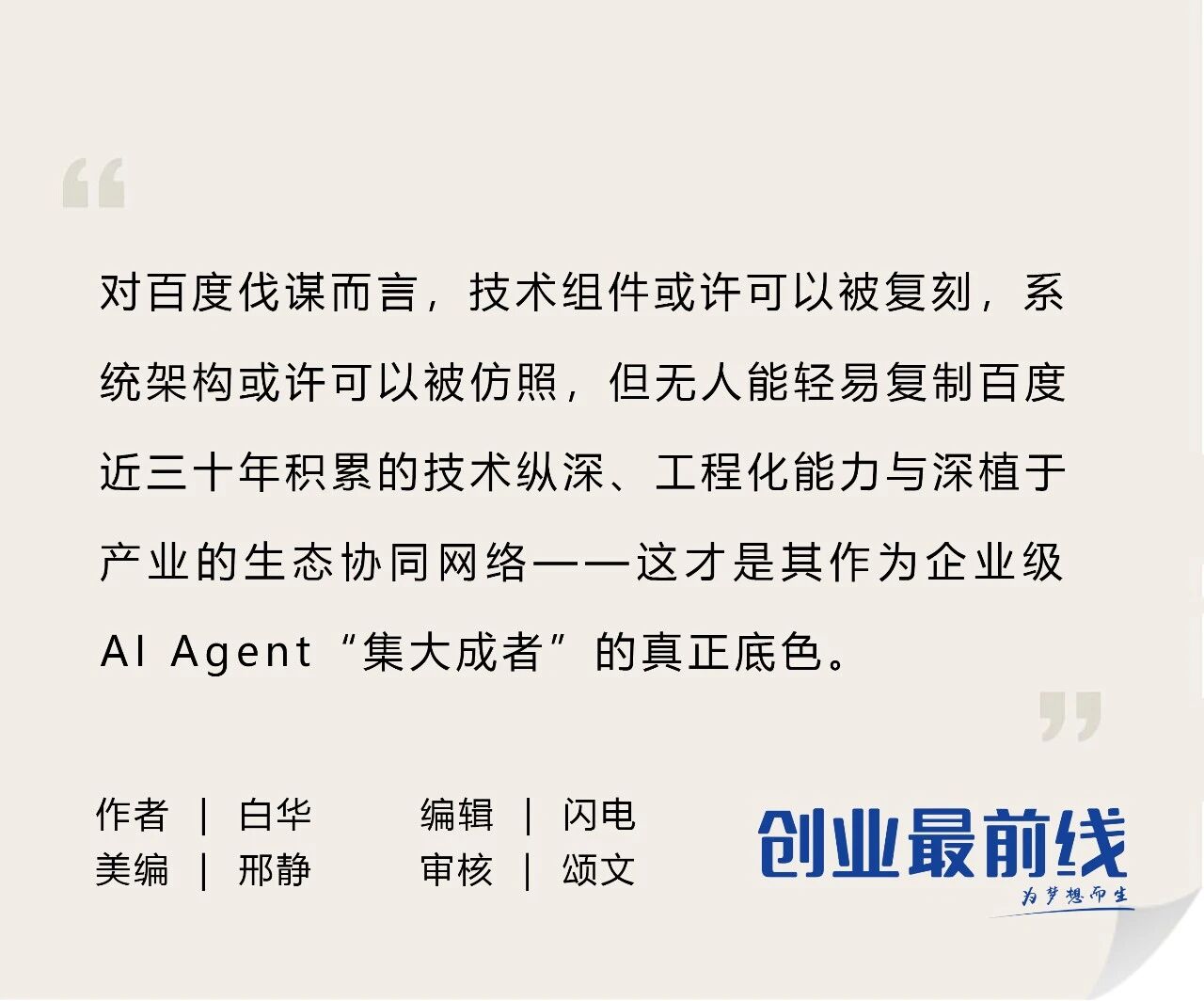 以百度伐谋为代表的企业级Agent新范式,是如何超越传统Agent单体智能的局限,成为企业真正的智能原生生产力?近期,「创业最前线」特别对话百度伐谋产品负责人李安南,试图揭秘这场从外围辅助到核心渗透的认知革命。