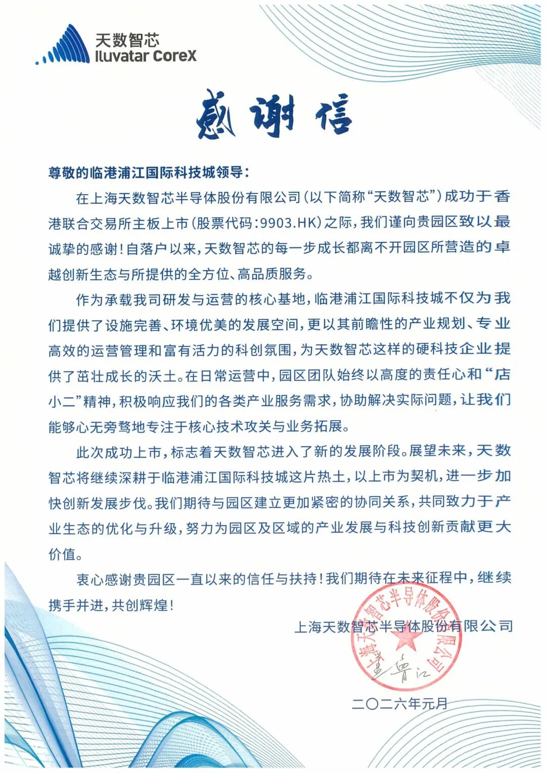 临港浦江国际科技城副总经理张潇丹在接受新华财经采访时,手中正拿着一封特殊的信件——来自新近成功上市的天数智芯的感谢信。“这是他们上市后发出的第一封感谢信。”她告诉新华财经。信纸上的亲笔签名带着真挚的诚意,字里行间满是对园区多年陪伴的感念——这份认可,恰是浦江国际科技城十年深耕的生动注脚。