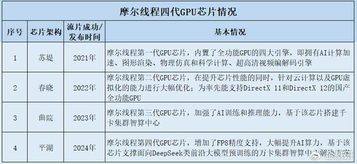 其中,2021-2024年,摩尔线程基于自主研发的MUSA架构,分别推出“苏堤”、“春晓”、“曲院”、“平湖”四代GPU芯片架构,并围绕芯片构建了板卡、一体机、智算集群等多种层级形态的全线产品矩阵,全方位满足企业级和消费级客户的不同需求。