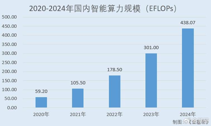 2020-2024年,国内智能算力规模分别为59.20EFLOPs、105.50EFLOPs、178.50EFLOPs、301.00EFLOPs、438.07EFLOPs,CAGR达64.9%,预计到2029年国内智能算力将增长至3,035.91EFLOPs,CAGR为45.3%。