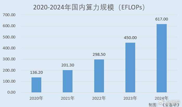 根据数据统计,2020-2024年,国内算力规模分别为136.20EFLOPs(每秒浮点运算次数)、201.30EFLOPs、298.50EFLOPs、450.00EFLOPs、617.00EFLOPs,CAGR达45.9%;预计到2029年国内算力规模将达到3,442.89EFLOPs,CAGR为40.0%。