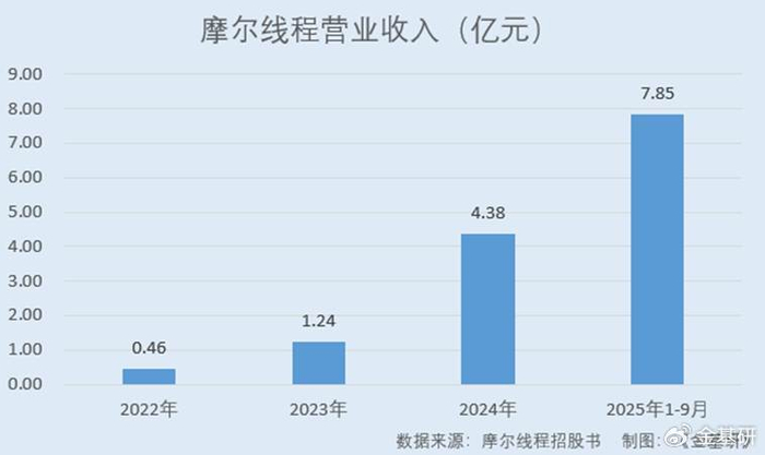 2022-2024年及2025年1-9月,摩尔线程的营业收入分别为0.46亿元、1.24亿元、4.38亿元、7.85亿元。