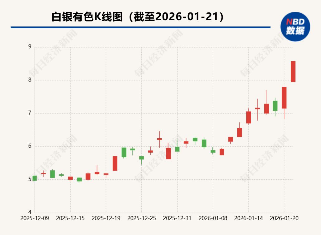 每经记者注意到,自1月13日以来,白银有色股价也跟随黄金板块走出一波强劲上涨的走势,最近两个交易日更是两连板。