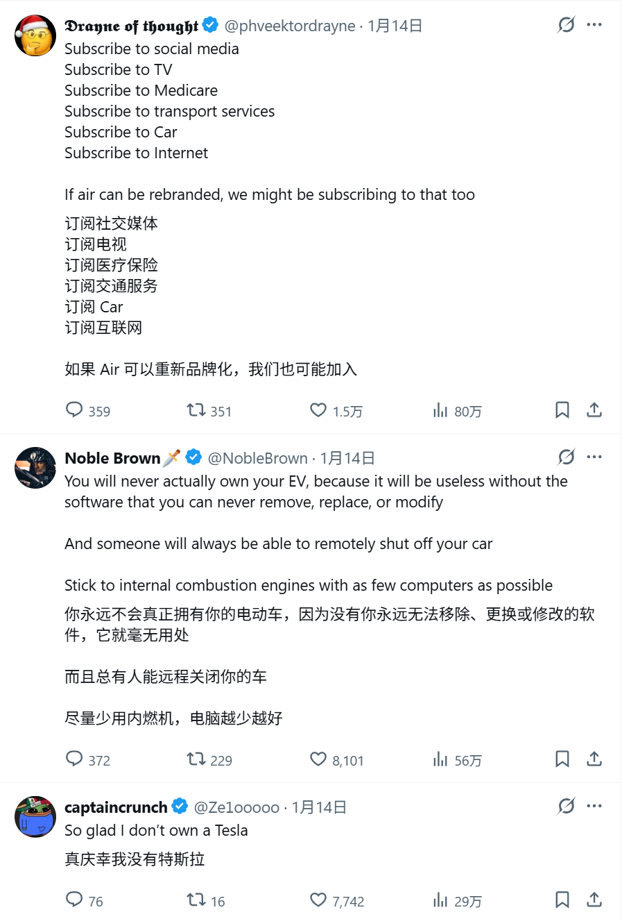 美国网友们抱怨的点在于,本来车子就是自己花钱买的,FSD也是宣传的大卖点,现在却彻底没了所有权,得一直租着,心里不爽就。。。
