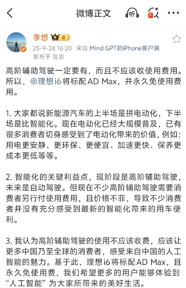 而且别说订阅了,就是智驾要不要收费,这个都吵过几回。之前,李想就发微博说,高阶辅助驾驶不应该收费。