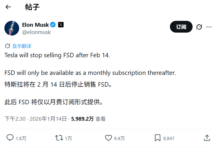 前些天,马斯克在X上突然宣布,在2月14日之后,特斯拉不再单卖FSD,而将只提供月度订阅的方式。