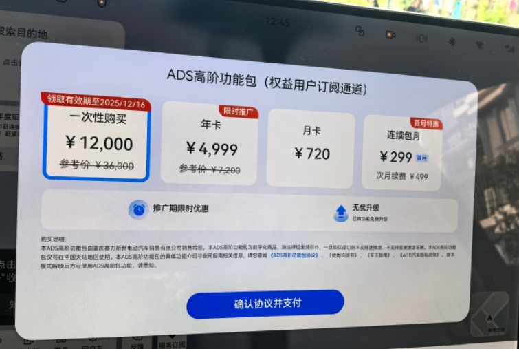 ADS是买断/订阅并行,比如在问界上,高阶版现在是原价3.6万元,限时3.2万元,再送个2万元的券,实际车主要花1.2万元,如果是走订阅,连续包月价格是499元/月。