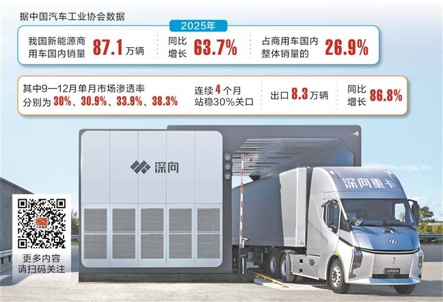 前述经销商感受到的情况,从新能源商用车销售数据中可以得到印证。据中国汽车工业协会数据,2025年,我国新能源商用车国内销量87.1万辆,同比增长63.7%,占商用车国内整体销量的26.9%,其中9—12月单月市场渗透率分别为30%、30.9%、33.9%、38.3%,连续4个月站稳30%关口;出口8.3万辆,同比增长86.8%。